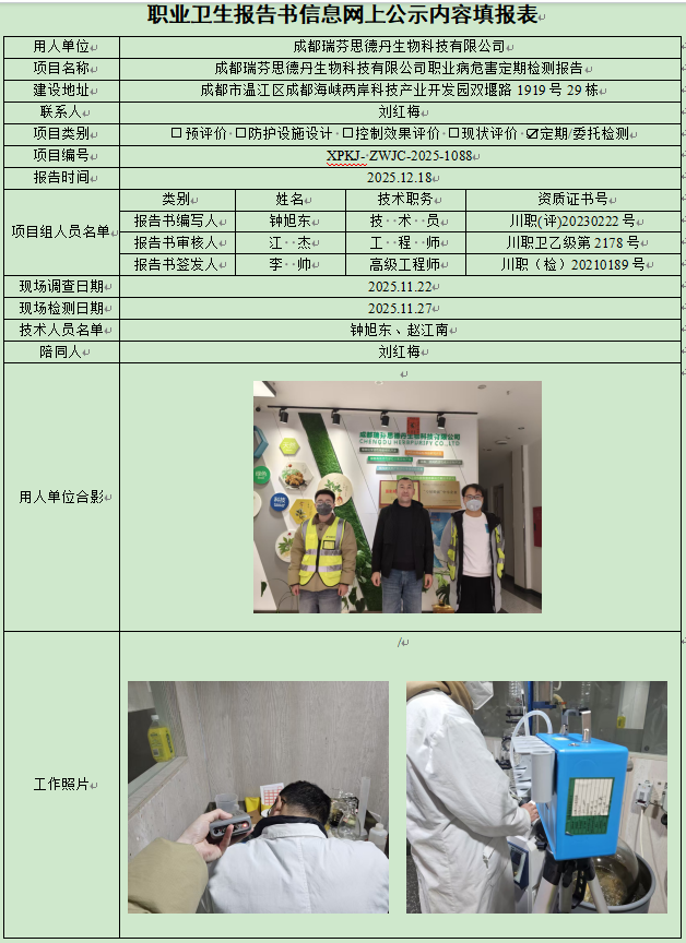 成都瑞芬思德丹生物科技有限公司职业病危害因素定期检测