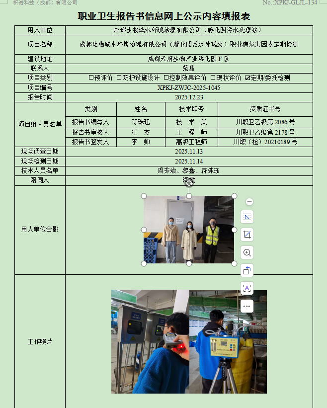 成都生物城水环境治理有限公司职业病危害因素定期检测