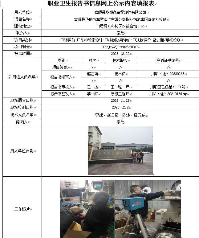 富顺县华盛汽车零部件有限公司职业病危害因素定期检测