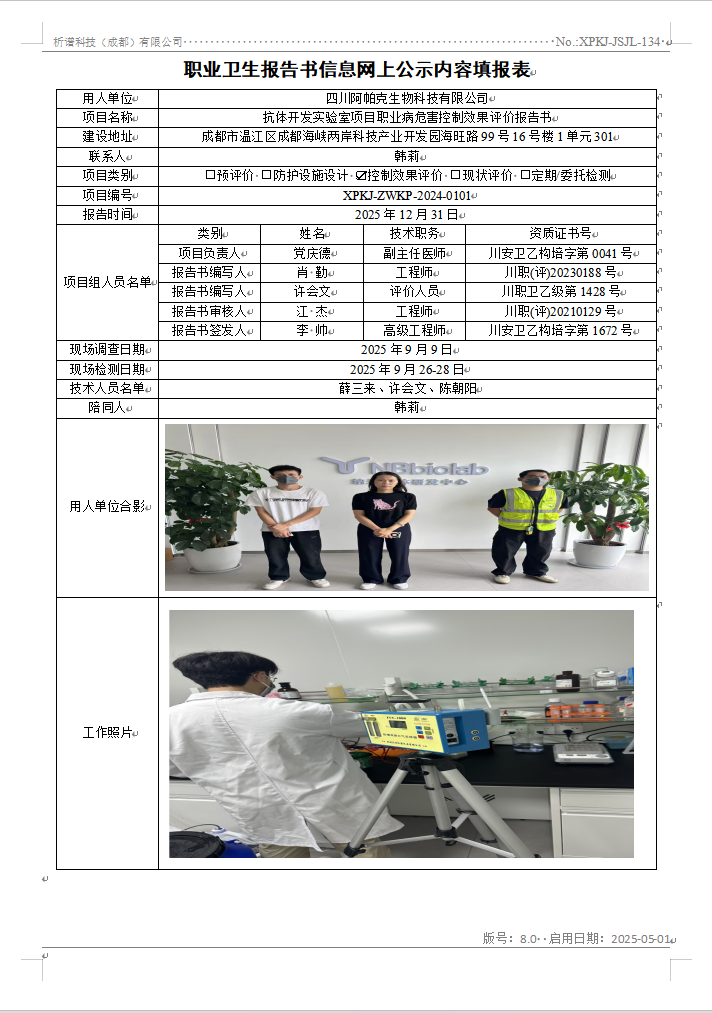 四川阿帕克生物科技有限公司职业病危害控制效果评价