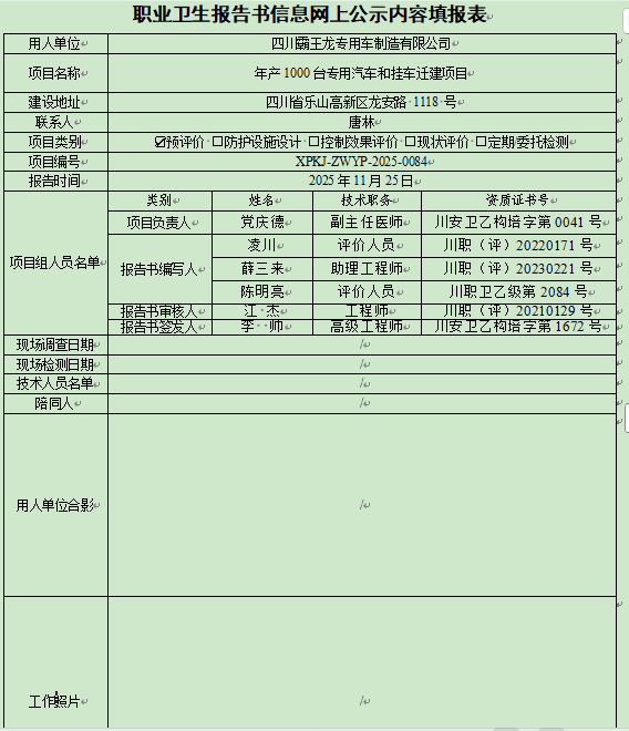 四川霸王龙专用车制造有限公司职业病危害预评价