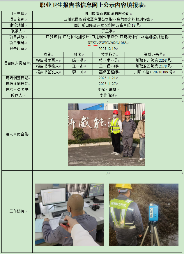 四川成眉新威能源有限公司职业病危害因素定期检测