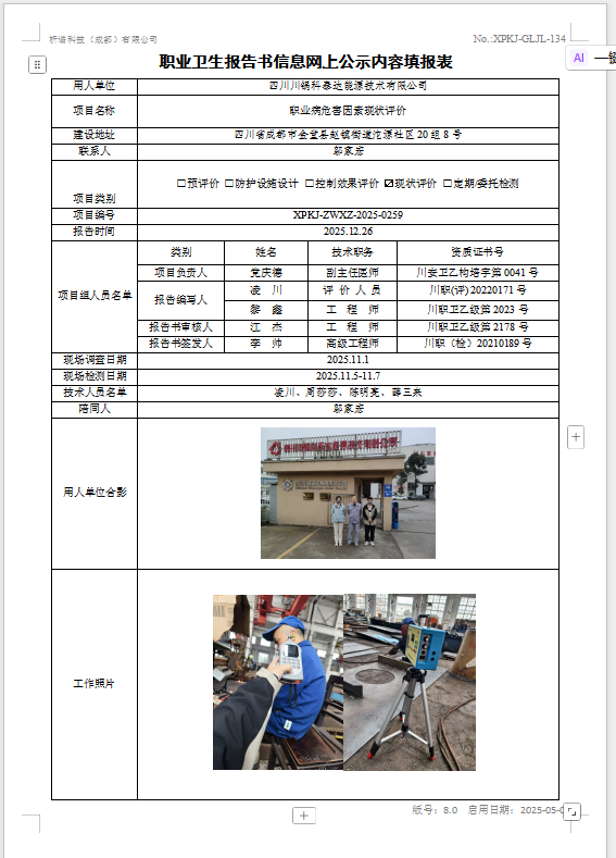 四川川锅科泰达能源技术有限公司职业病危害现状评价