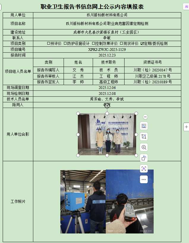 四川丽标新材料有限公司职业病危害因素定期检测