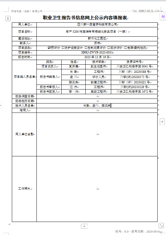 四川新一美营养科技有限公司职业病危害预评价
