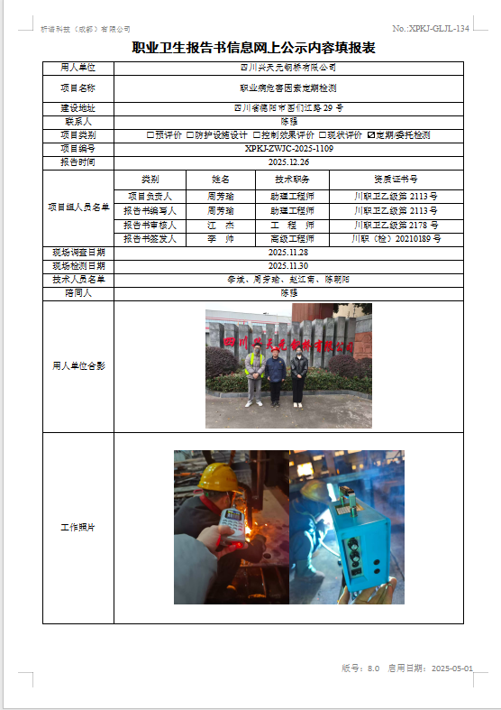 四川兴天元钢桥有限公司职业病危害因素定期检测