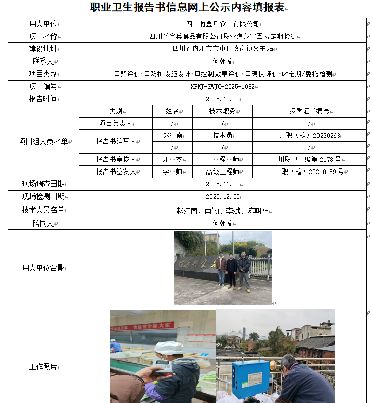 四川竹鑫兵食品有限公司职业病危害因素定期检测