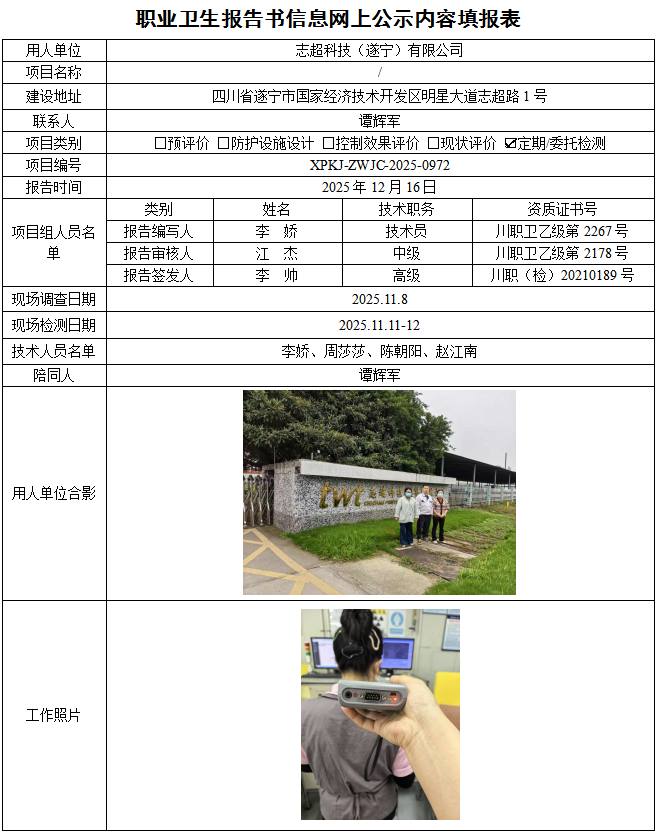 志超科技(遂宁)有限公司职业病危害因素定期检测