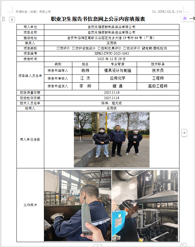 自贡兆强密封制品实业有限公司职业病危害因素定期检测