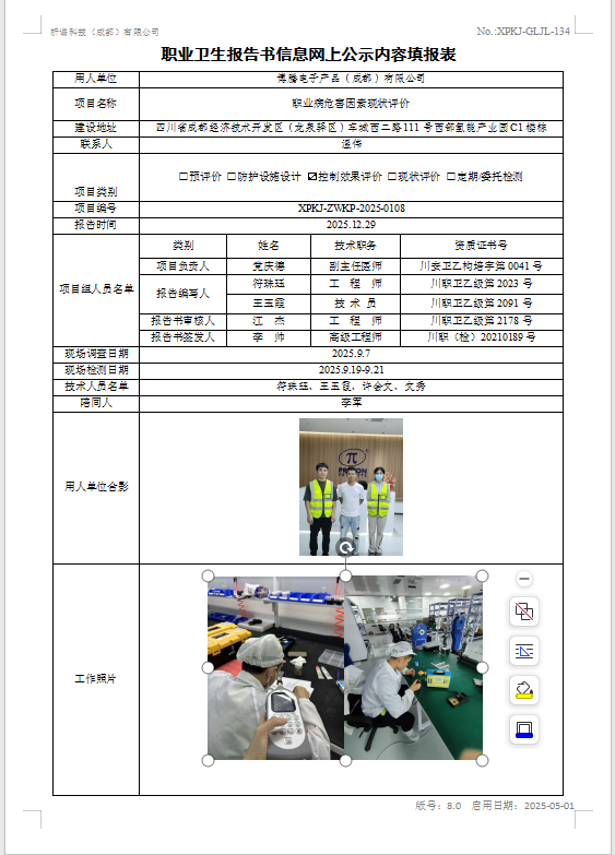 博腾电子产品(成都)有限公司职业病危害控制效果评价