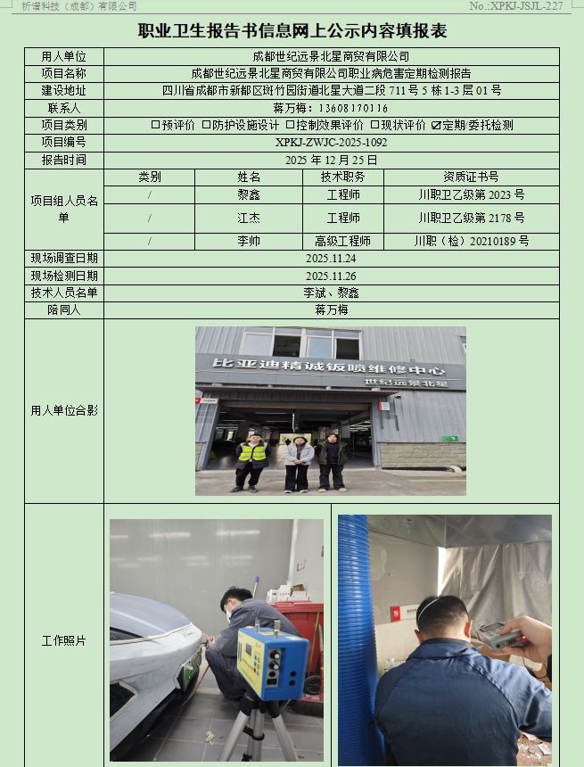 成都世纪远景北星商贸有限公司职业病危害因素定期检测
