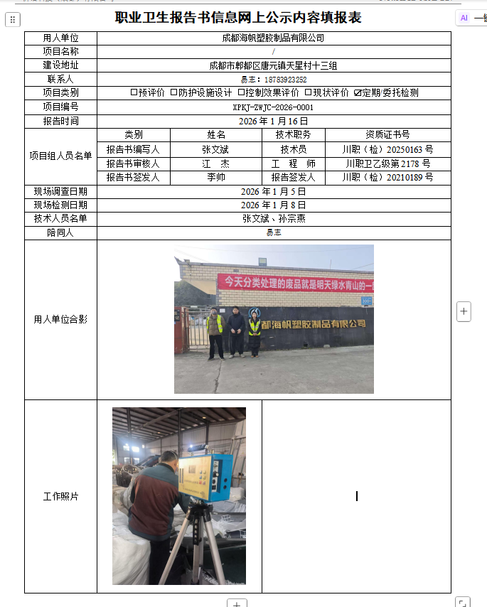 成都海帆塑胶制品有限公司职业病危害因素定期检测