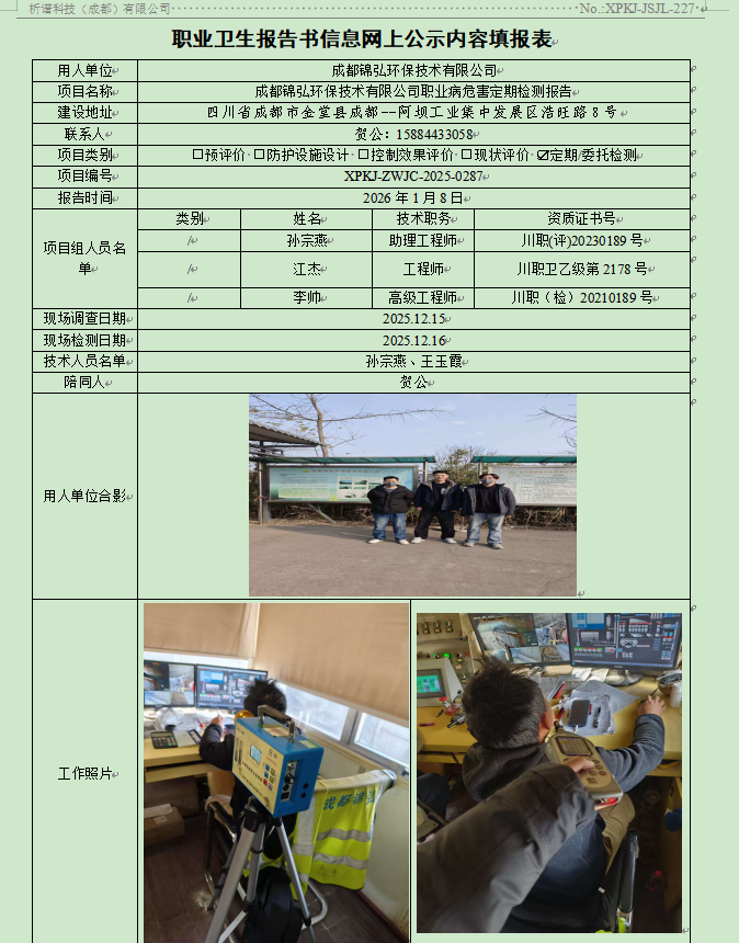 成都锦弘环保技术有限公司职业病危害因素定期检测