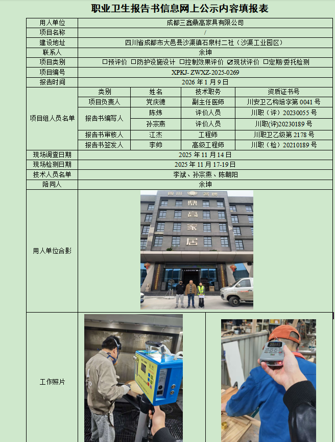 成都三鑫鼎高家具有限公司职业病危害现状评价
