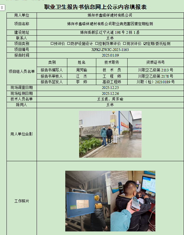 绵阳市鑫瑞翔建材有限公司职业病危害因素定期检测