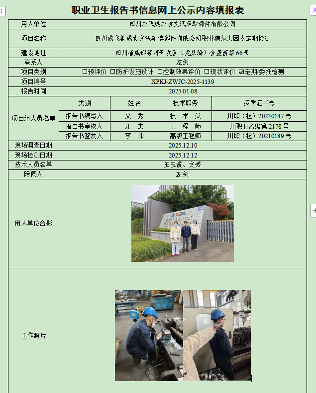 四川成飞集成吉文汽车零部件有限公司职业病危害因素定期检测
