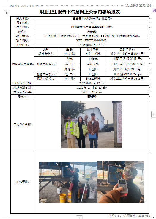 金堂县玉凤肥料有限责任公司职业病危害现状评价
