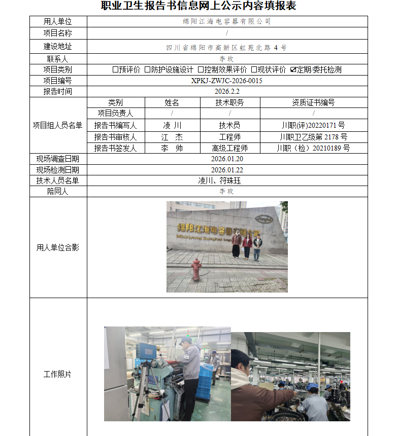 绵阳江海电容器有限公司职业病危害因素定期检测