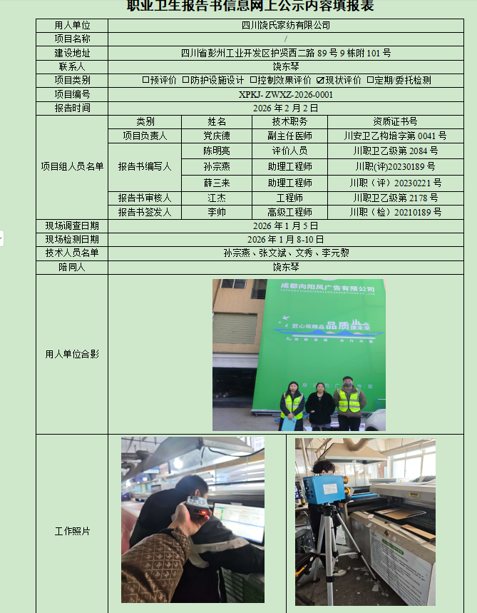 四川饶氏家纺有限公司职业病危害现状评价