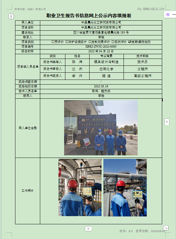 中昊晨光化工研究院有限公司职业病危害因素委托检测
