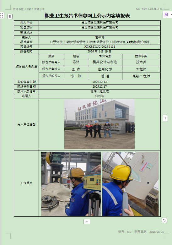 自贡博发能源科技有限公司职业病危害因素定期检测