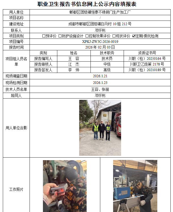 郫都区团结镇恒泰不锈钢门生产加工厂职业病危害因素定期检测