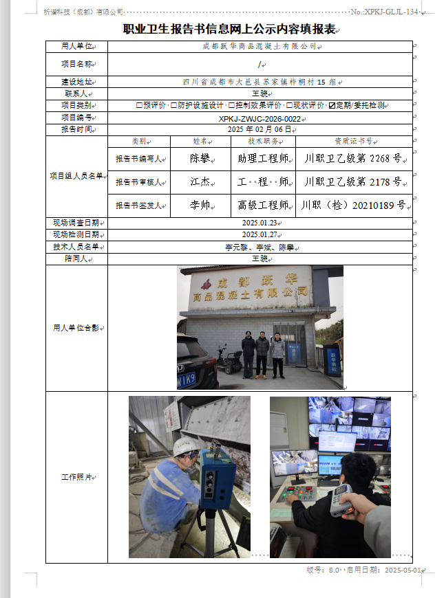 成都跃华商品混凝土有限公司职业病危害因素定期检测