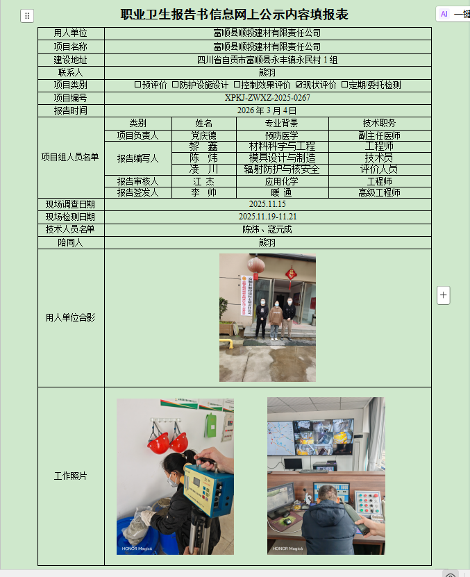 富顺县顺投建材有限责任公司职业病危害现状评价