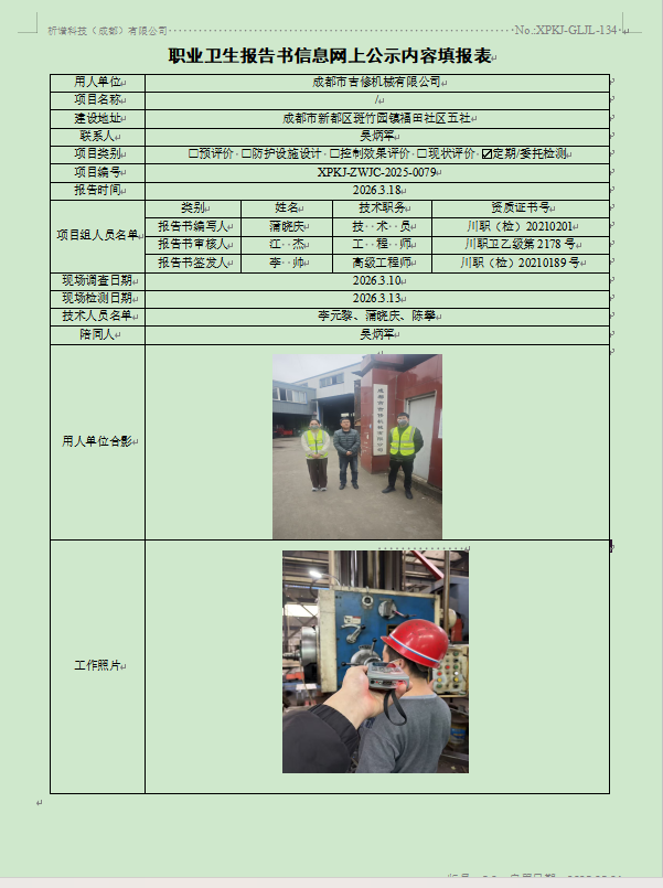 成都市吉修机械有限公司职业病危害因素定期检测