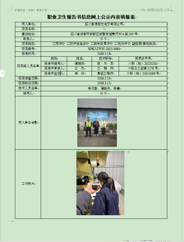 四川宜得新光电子有限公司职业病危害因素定期检测