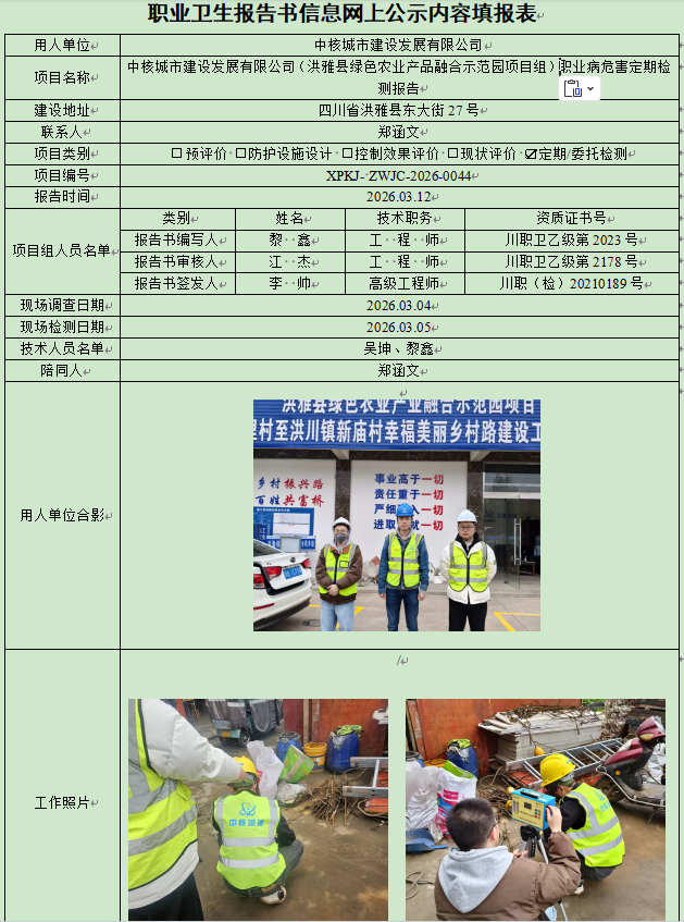 中核城市建设发展有限公司职业病危害因素定期检测