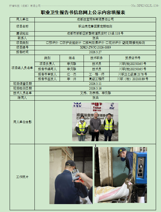 成都法宝饲料有限责任公司职业病危害因素定期检测