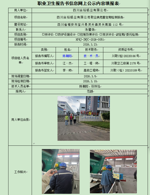 四川合裕铝业有限公司职业病危害因素定期检测