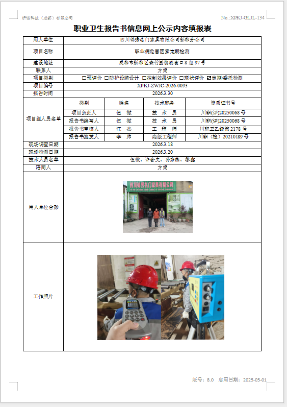 四川锦秀名门家具有限公司新都分公司职业病危害因素定期检测