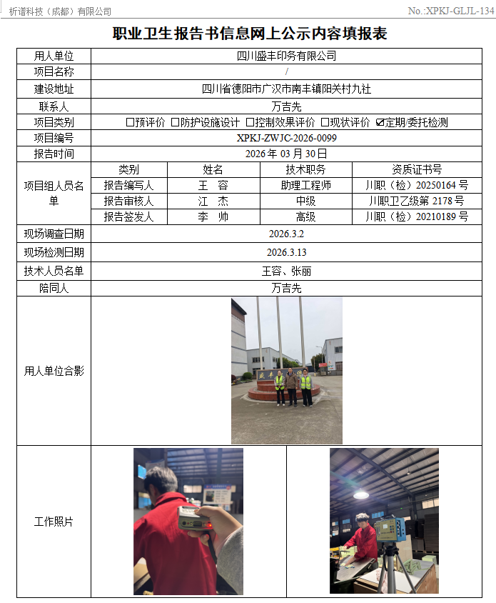 四川锦秀名门家具有限公司新都分公司职业病危害因素定期检测
