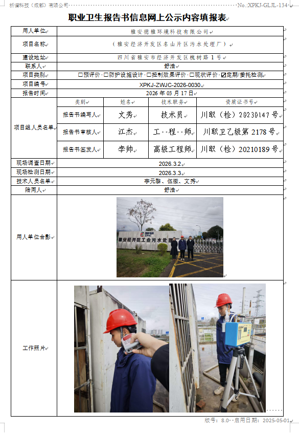 雅安德雅环境科技有限公司名山片区污水处理厂职业病危害因素定期检测
