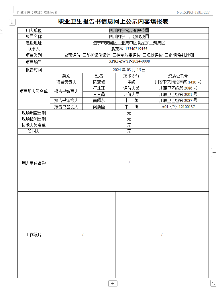 四川阿宁食品有限公司四川阿宁工厂燃鸭项目职业病危害预评价