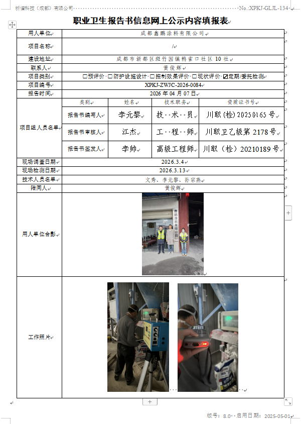 成都鑫鹏涂料有限公司职业病危害因素定期检测