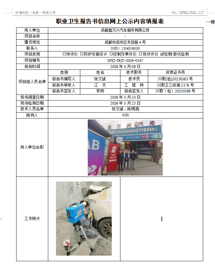 成都鑫万兴汽车服务有限公司职业病危害因素定期检测