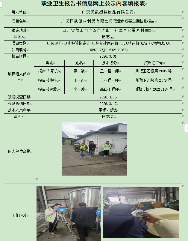 广汉民凯塑料制品有限公司职业病危害因素定期检测