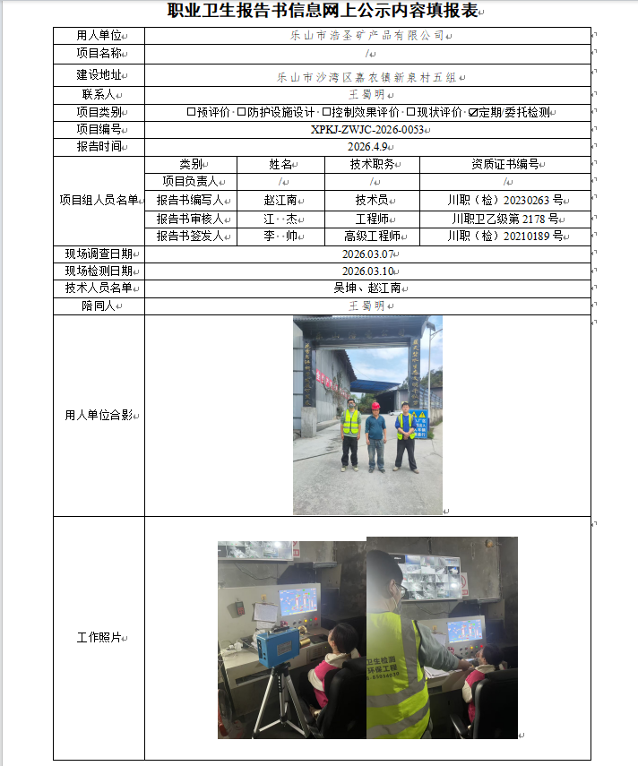乐山市浩圣矿产品有限公司职业病危害因素定期检测