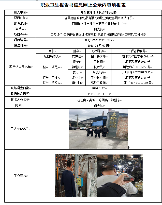 隆昌嘉隆玻璃制品有限公司职业病危害现状评价