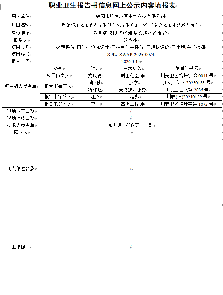 绵阳市斯麦尔顾生物科技有限公司职业病危害预评价