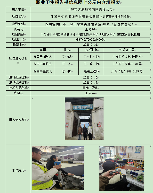 什邡市少成服饰有限责任公司职业病危害因素定期检测