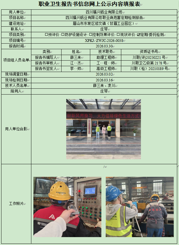 四川福兴铝业有限公司职业病危害因素定期检测