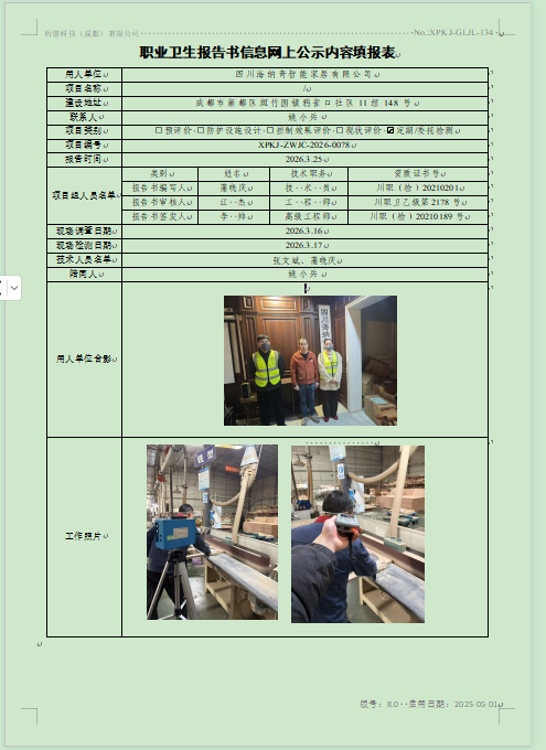 四川海纳奇智能家居有限公司职业病危害因素定期检测