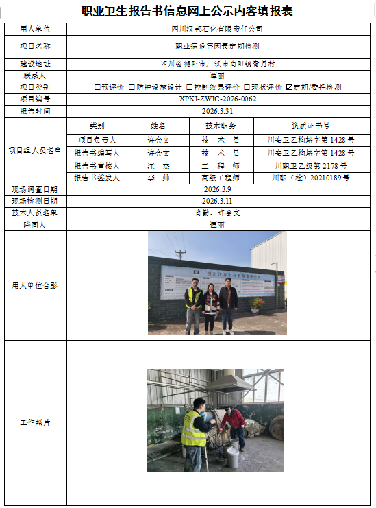 四川汉邦石化有限责任公司职业病危害因素定期检测