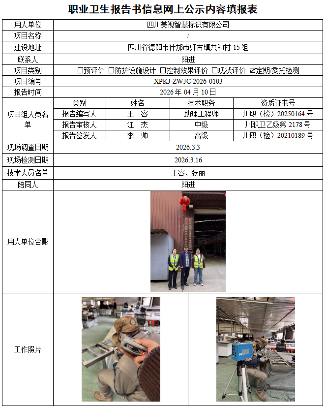 四川美视智慧标识有限公司职业病危害因素定期检测