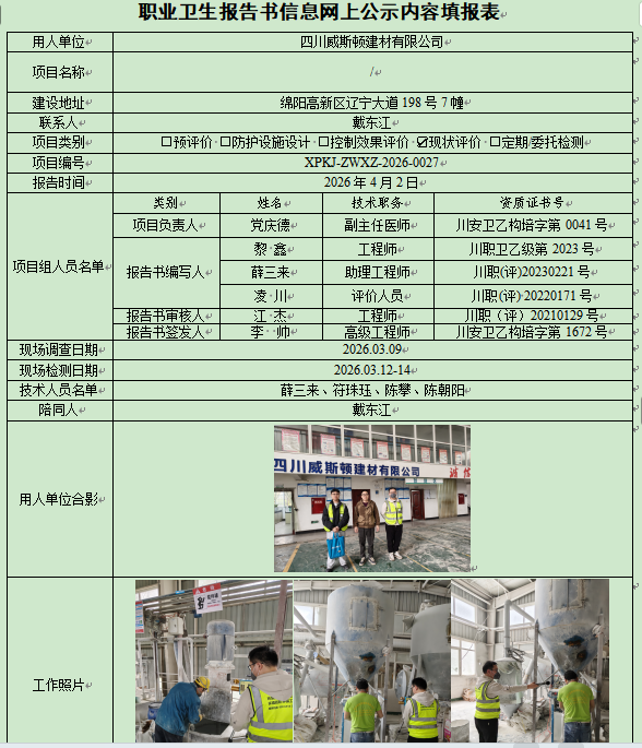 四川威斯顿建材有限公司职业病危害现状评价