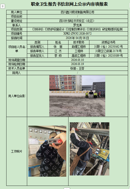 四川鑫川缆线制造有限公司职业病危害因素定期检测